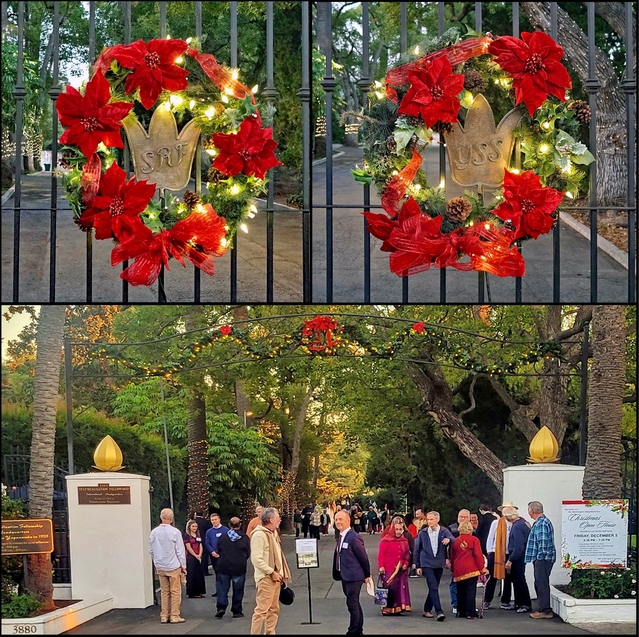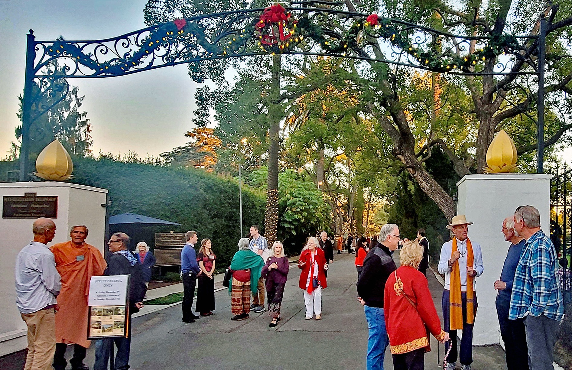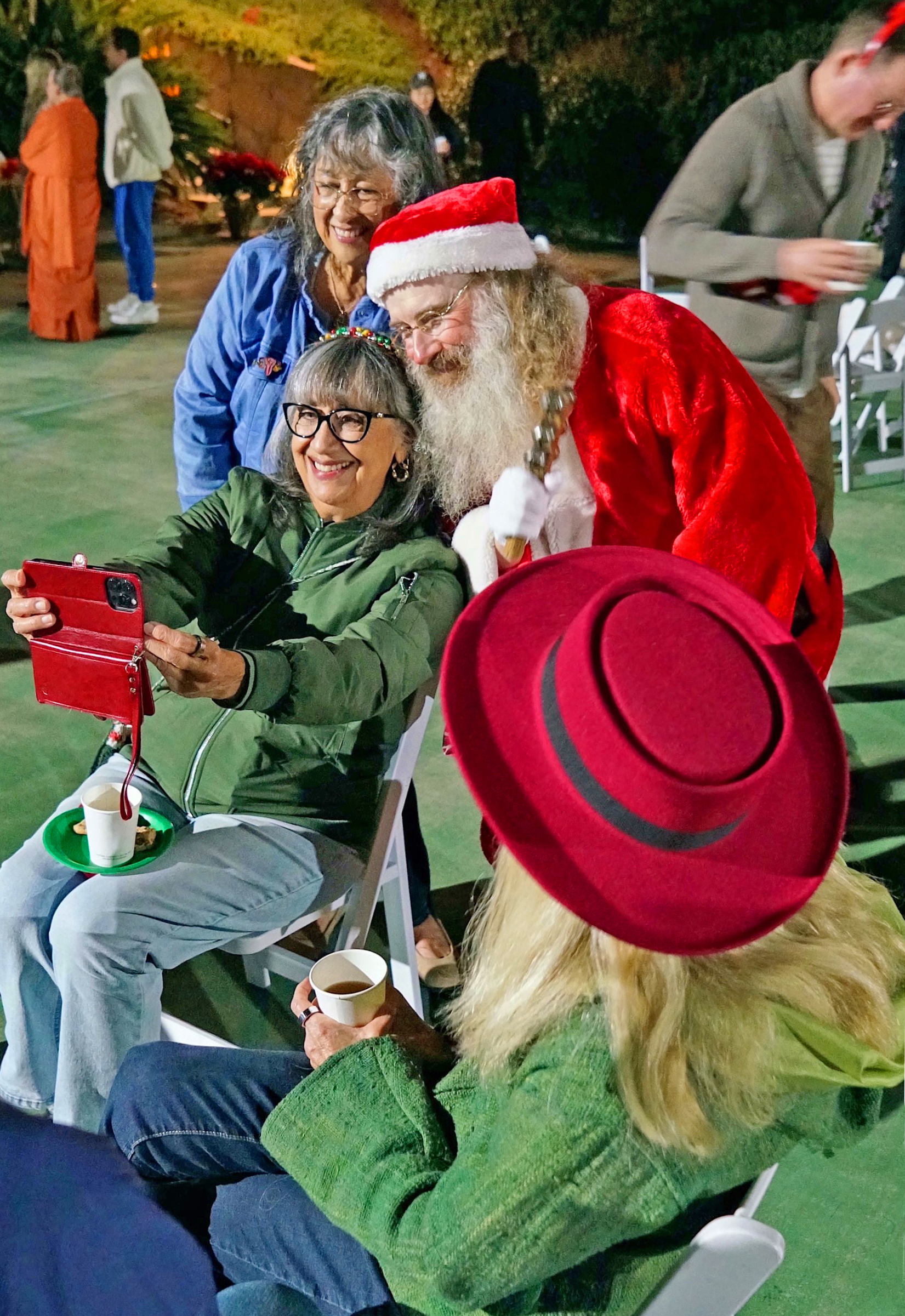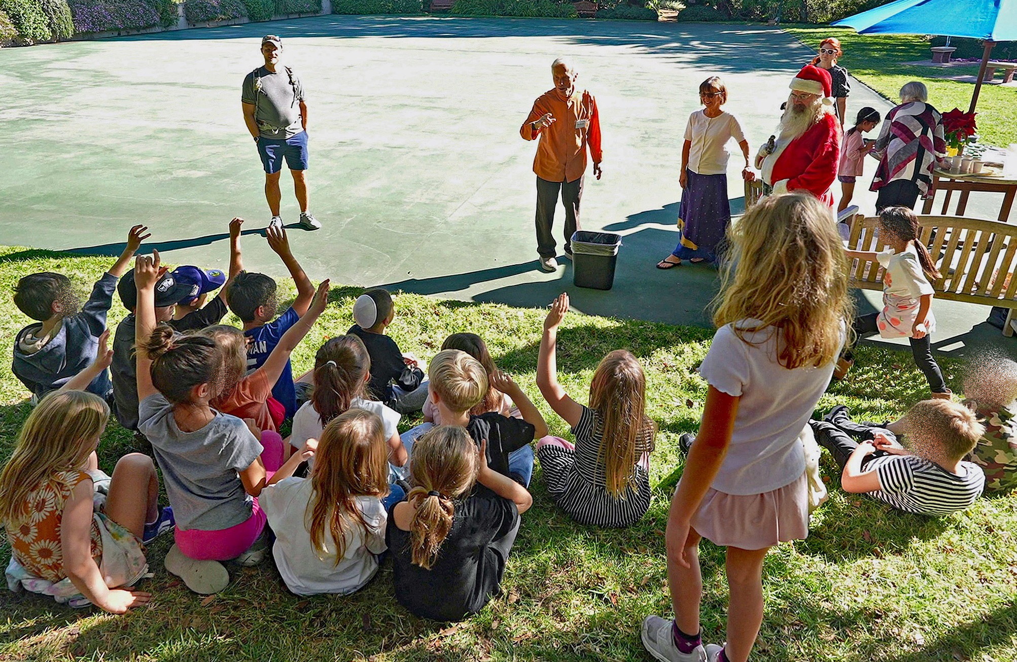 Held on Friday evening, December 5, the festive event drew more than 240 neighbors to the Mother Center, where they were greeted by SRF monks and nuns. Visitors were able to view the many unique decorations in the Reception Hall of the main building and enjoy visits with Santa Claus and his elf under a decorated tent on the tennis court, where refreshments were offered and carolers uplifted the gathering with Christmas cheer. It was a special joy to share the universal spirit of Christmas with our neighbors.