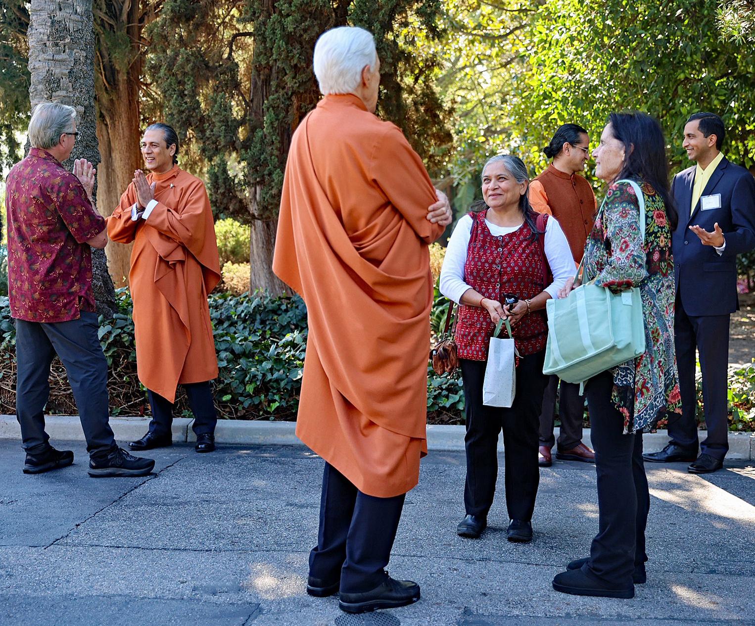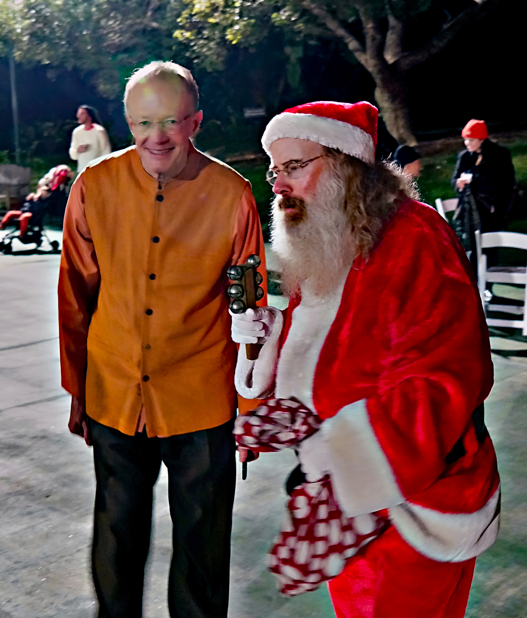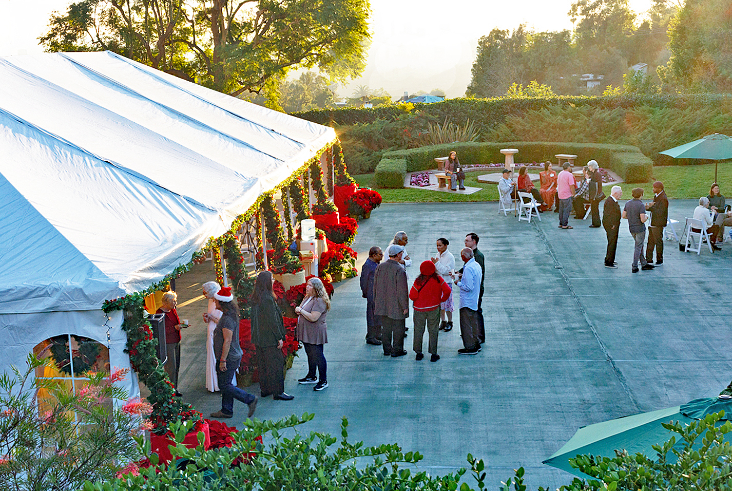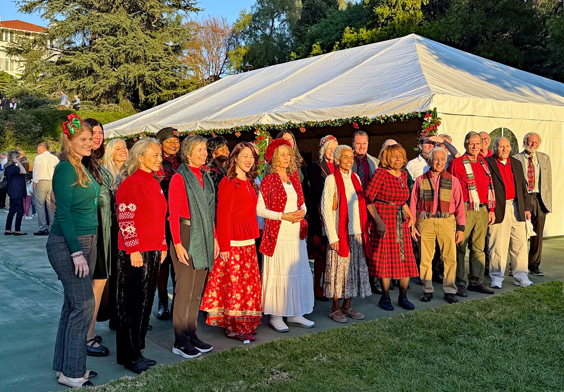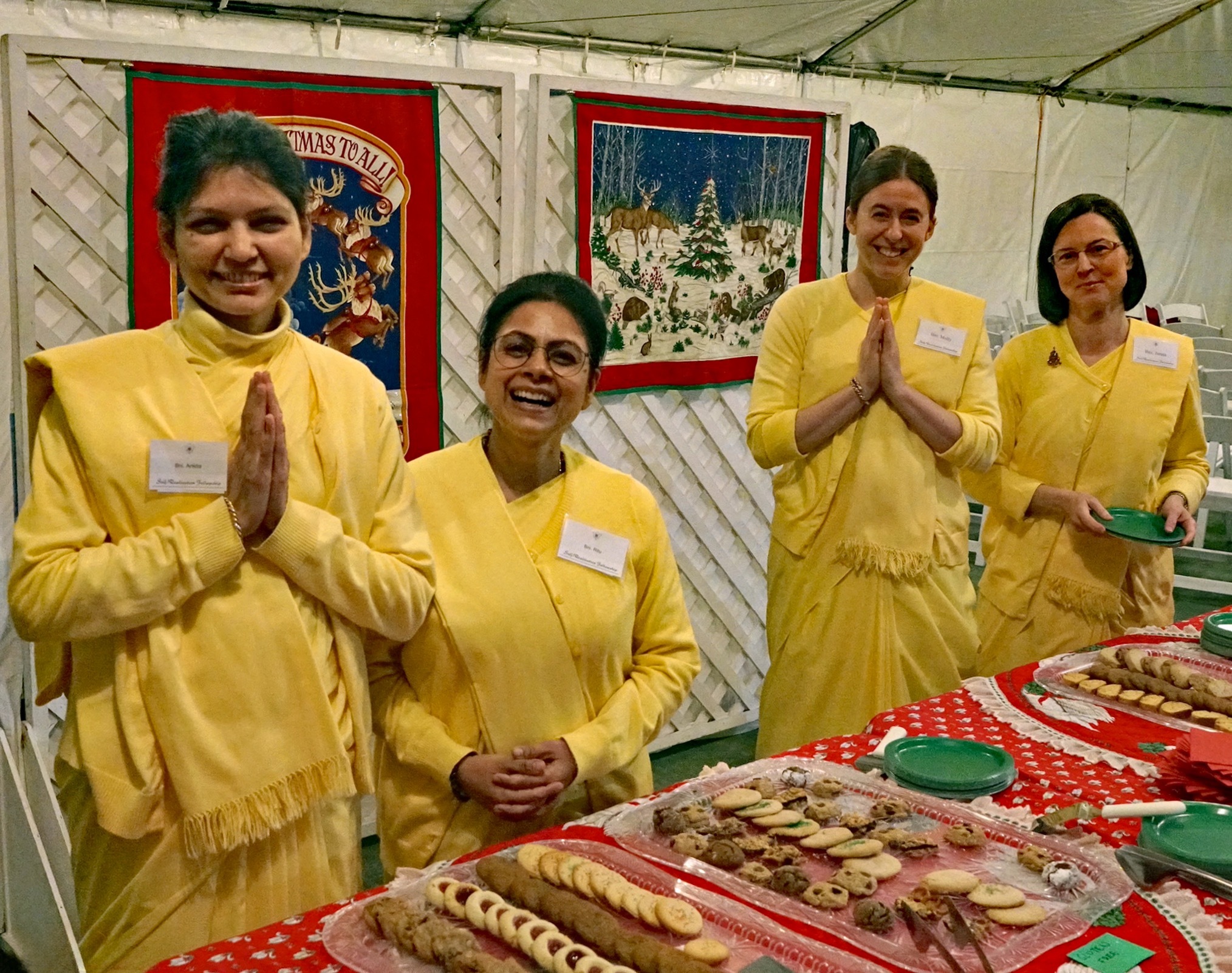 Held on Friday evening, December 5, the festive event drew more than 240 neighbors to the Mother Center, where they were greeted by SRF monks and nuns. Visitors were able to view the many unique decorations in the Reception Hall of the main building and enjoy visits with Santa Claus and his elf under a decorated tent on the tennis court, where refreshments were offered and carolers uplifted the gathering with Christmas cheer. It was a special joy to share the universal spirit of Christmas with our neighbors.