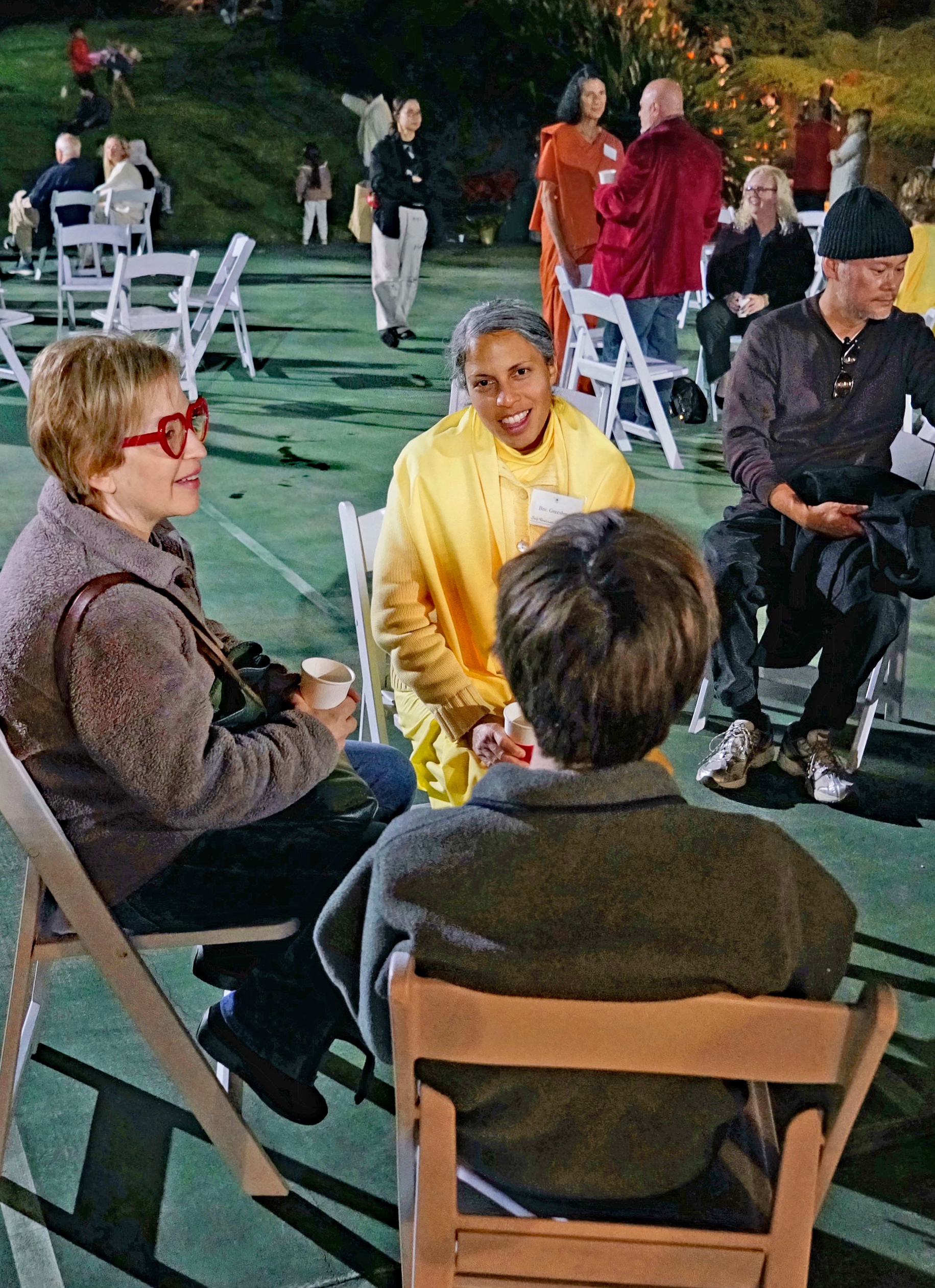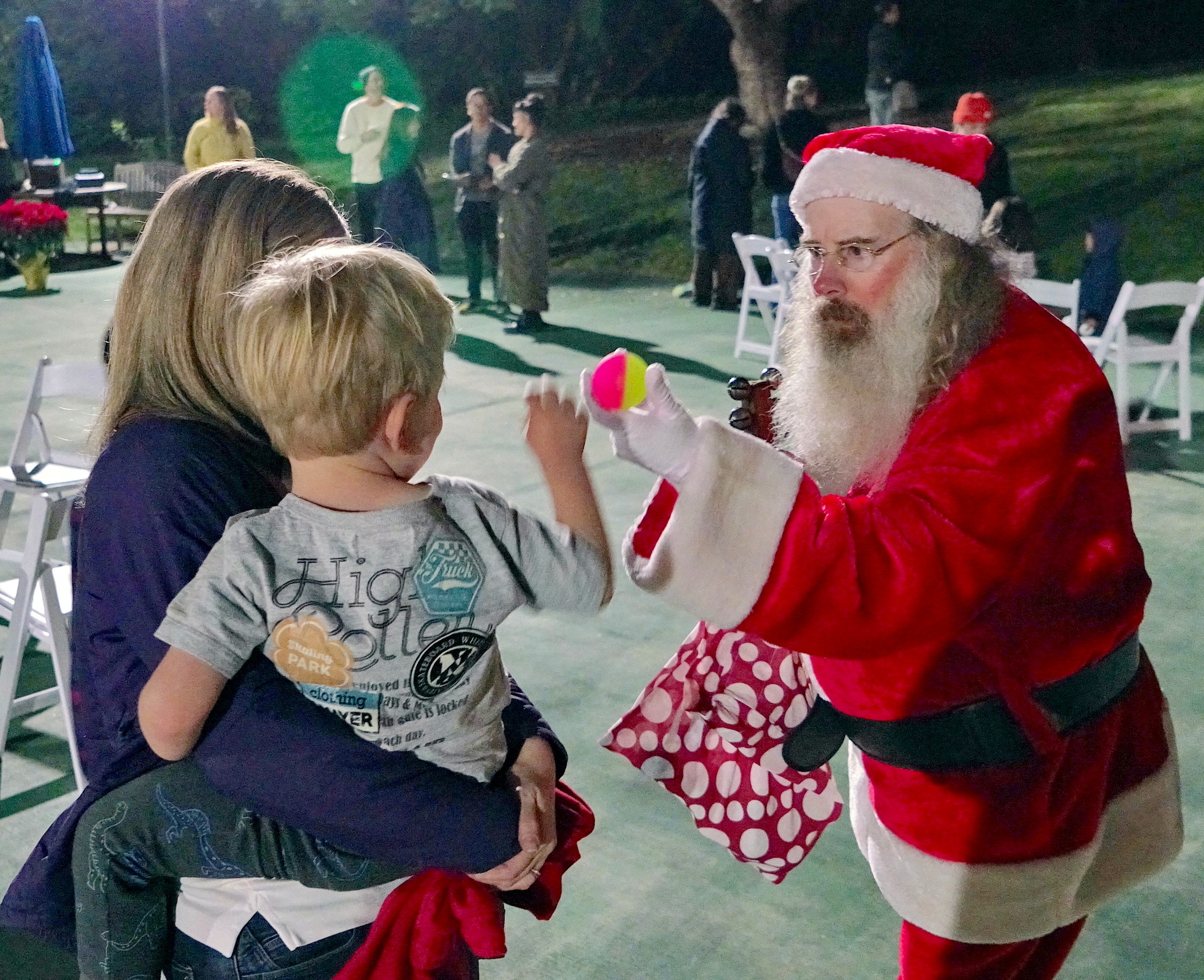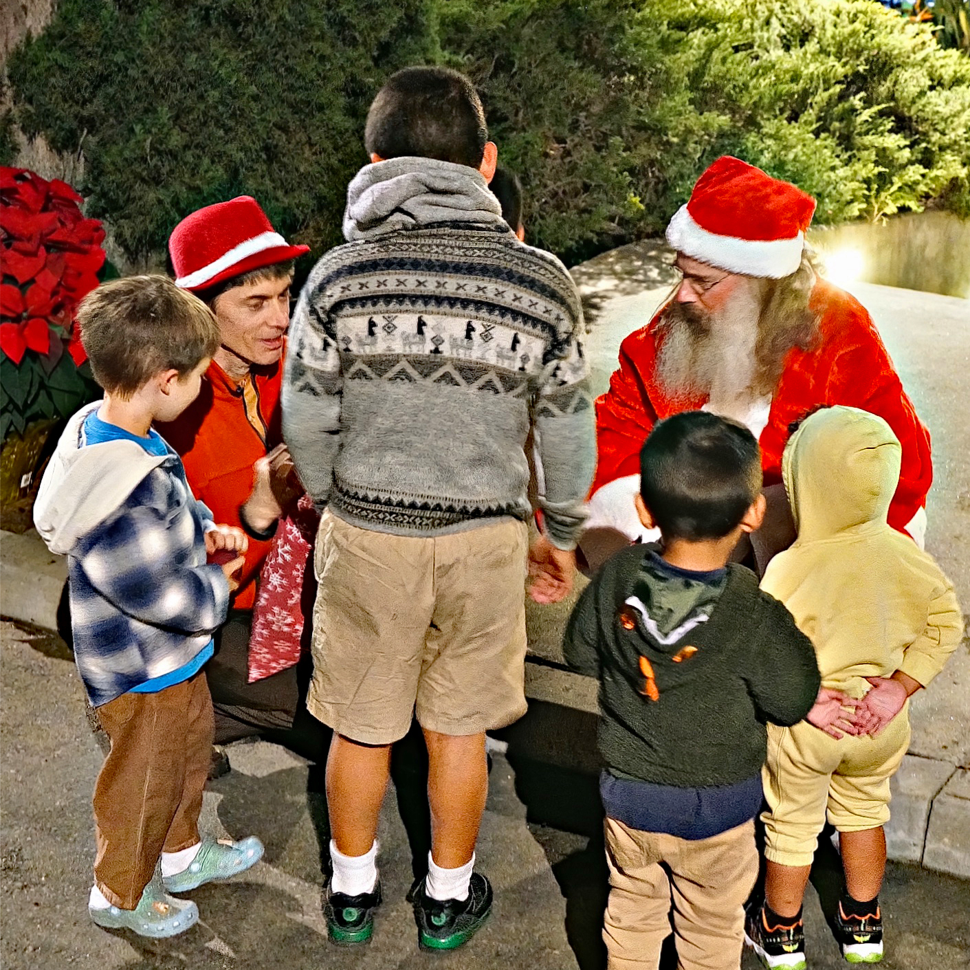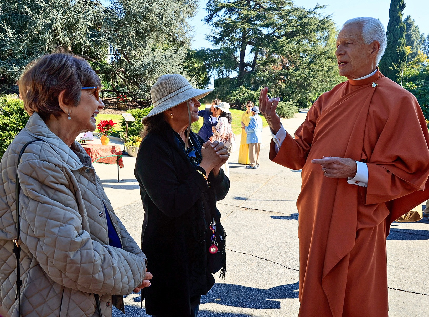 Held on Friday evening, December 5, the festive event drew more than 240 neighbors to the Mother Center, where they were greeted by SRF monks and nuns. Visitors were able to view the many unique decorations in the Reception Hall of the main building and enjoy visits with Santa Claus and his elf under a decorated tent on the tennis court, where refreshments were offered and carolers uplifted the gathering with Christmas cheer. It was a special joy to share the universal spirit of Christmas with our neighbors.