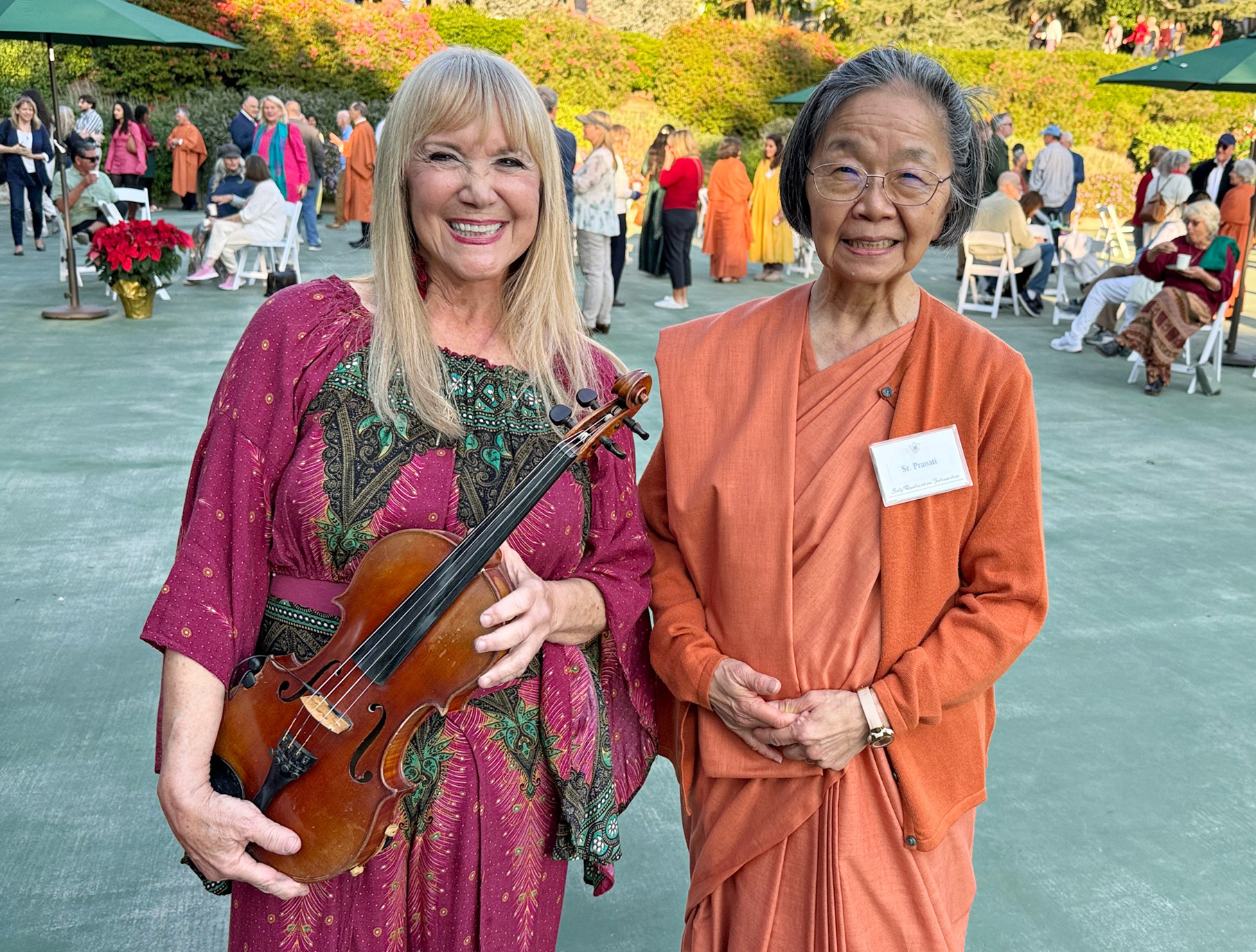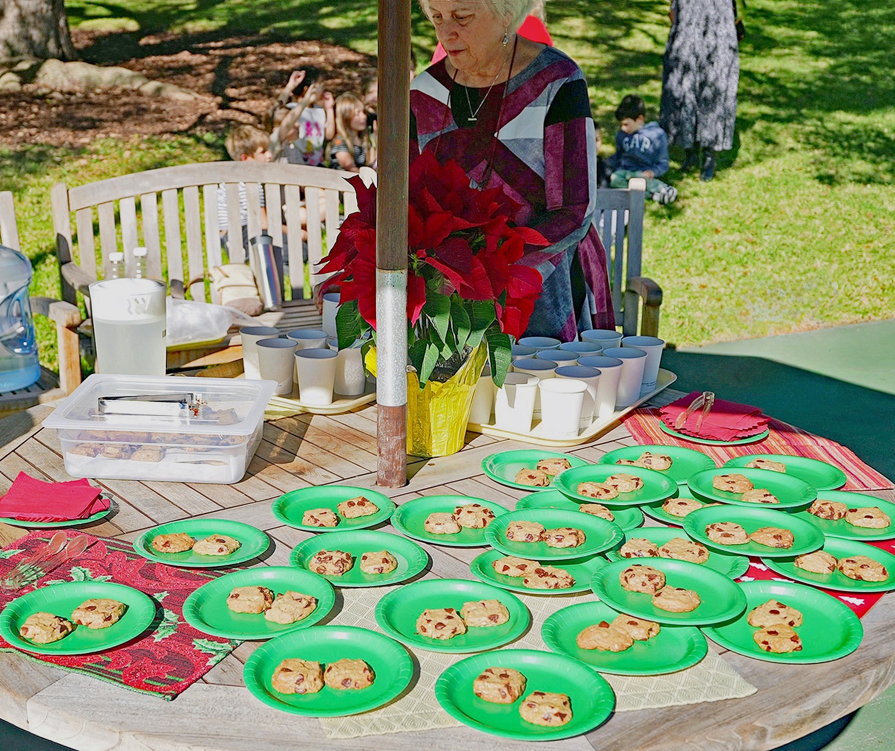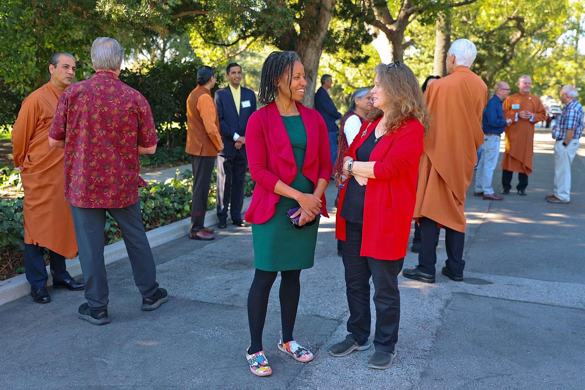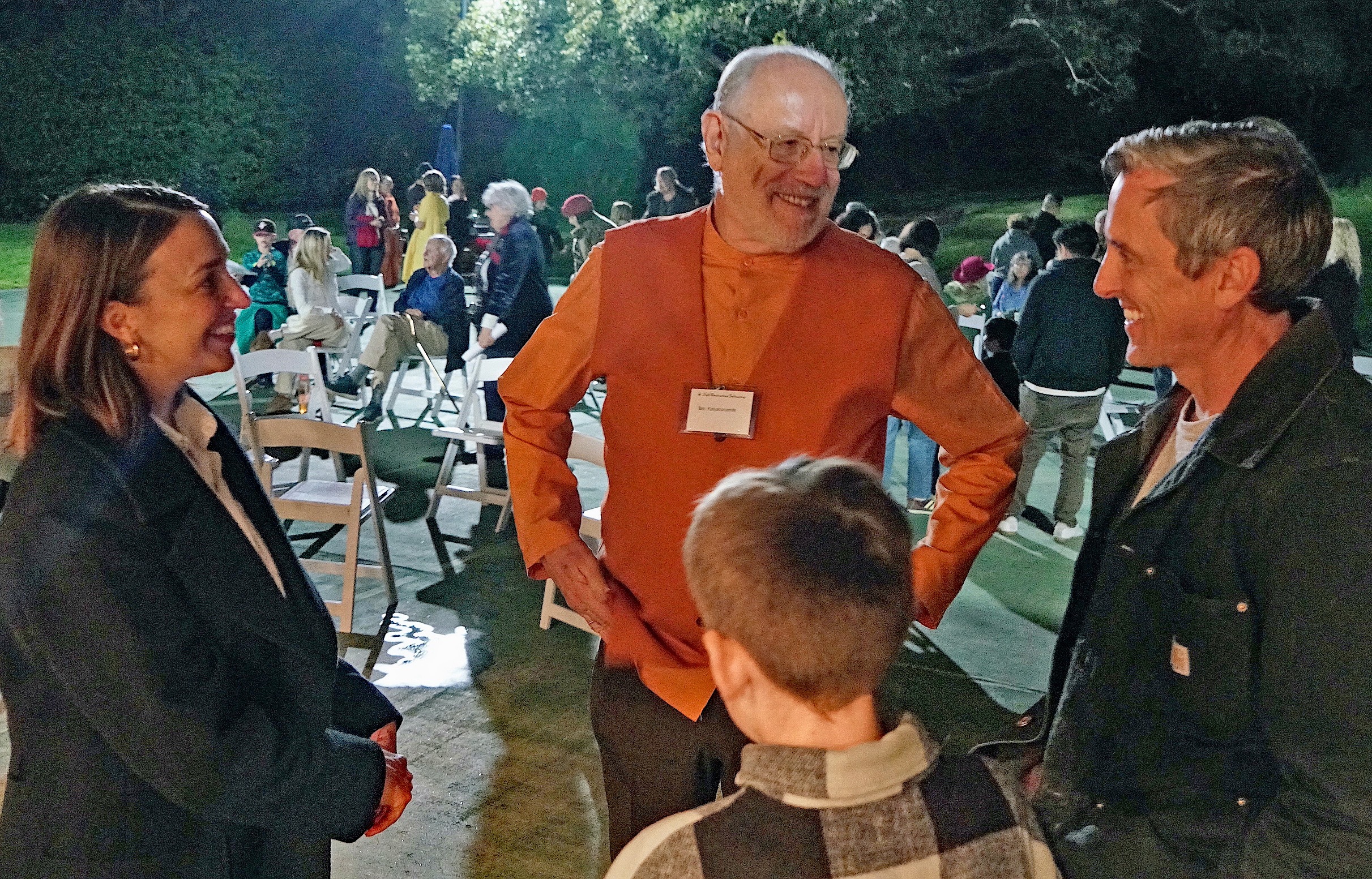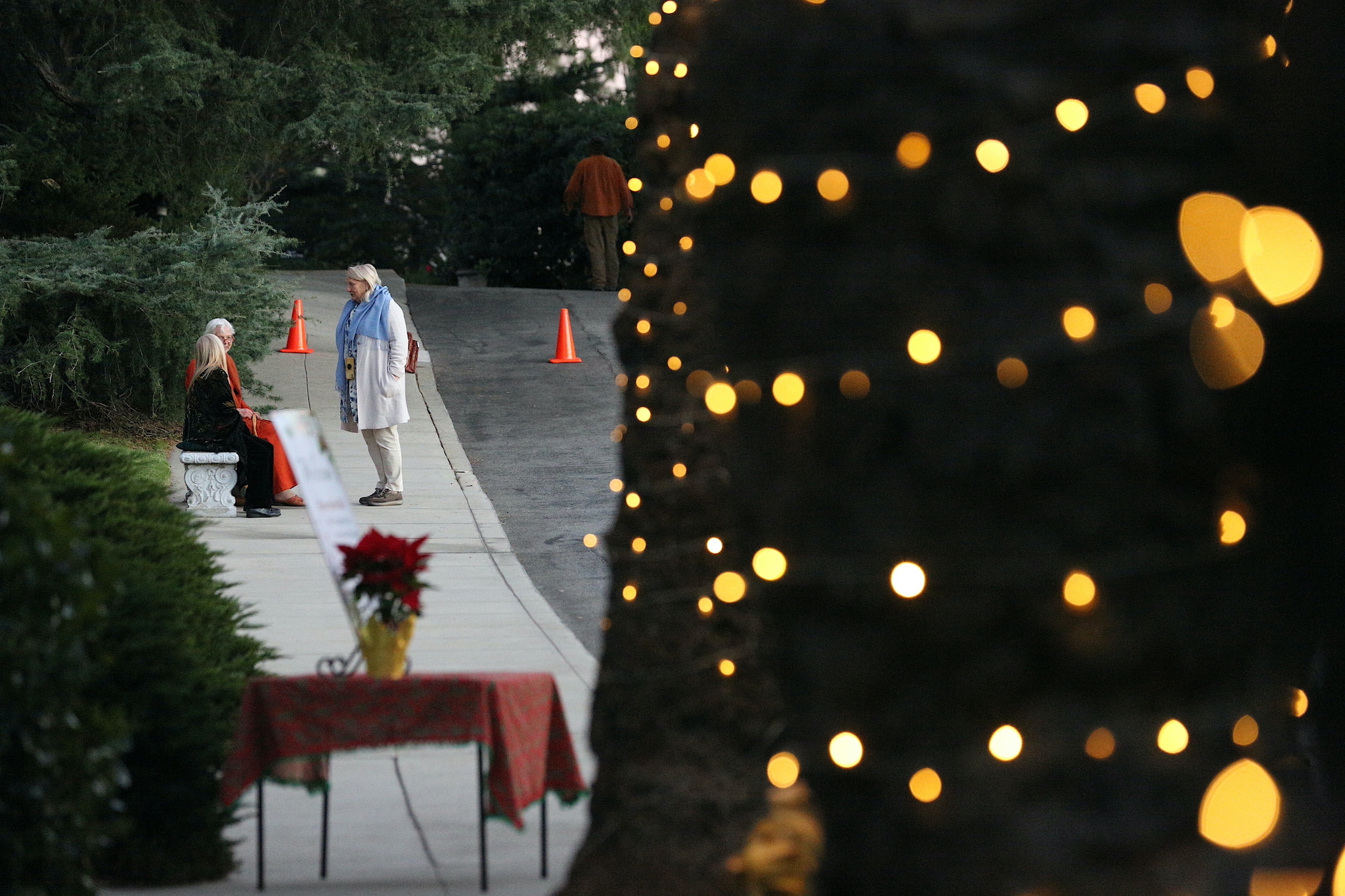 Held on Friday evening, December 5, the festive event drew more than 240 neighbors to the Mother Center, where they were greeted by SRF monks and nuns. Visitors were able to view the many unique decorations in the Reception Hall of the main building and enjoy visits with Santa Claus and his elf under a decorated tent on the tennis court, where refreshments were offered and carolers uplifted the gathering with Christmas cheer. It was a special joy to share the universal spirit of Christmas with our neighbors.