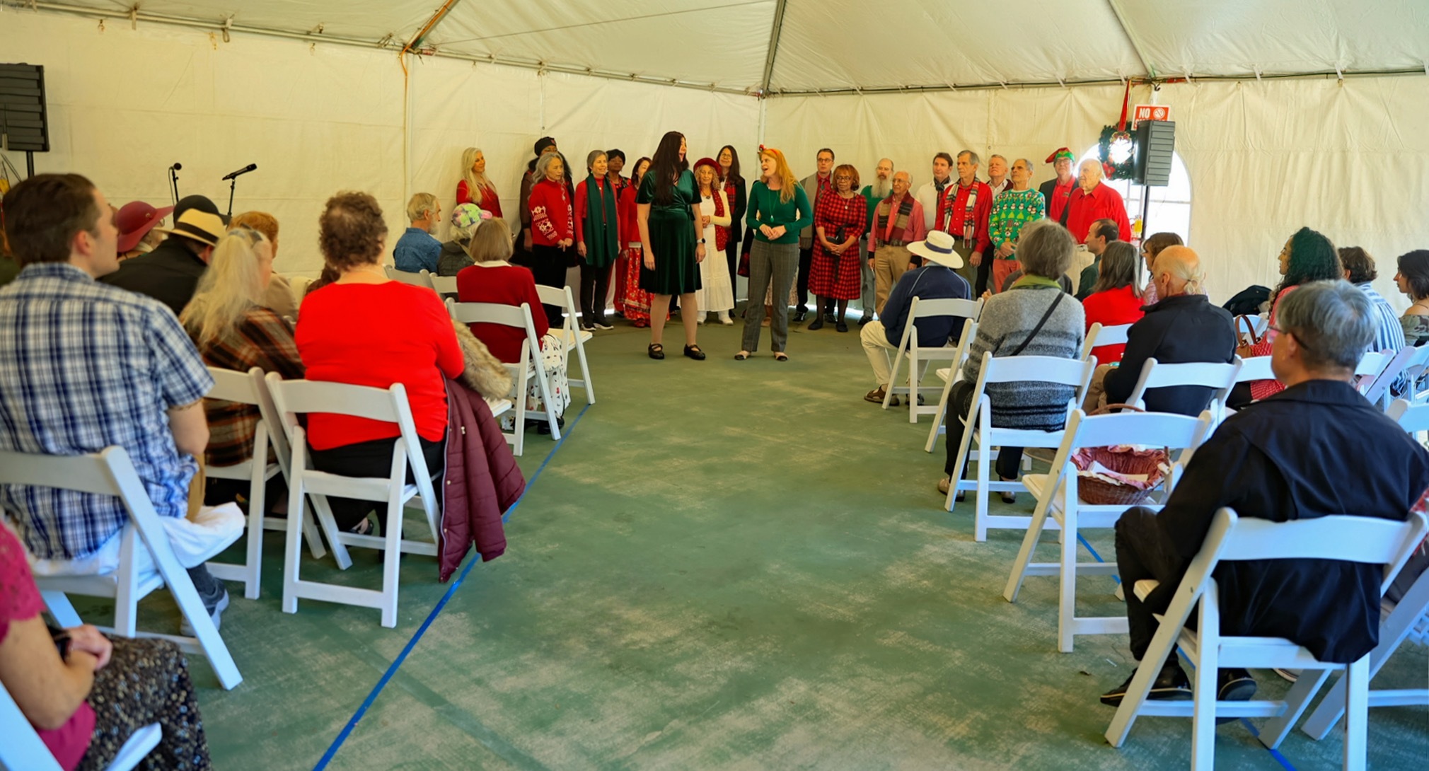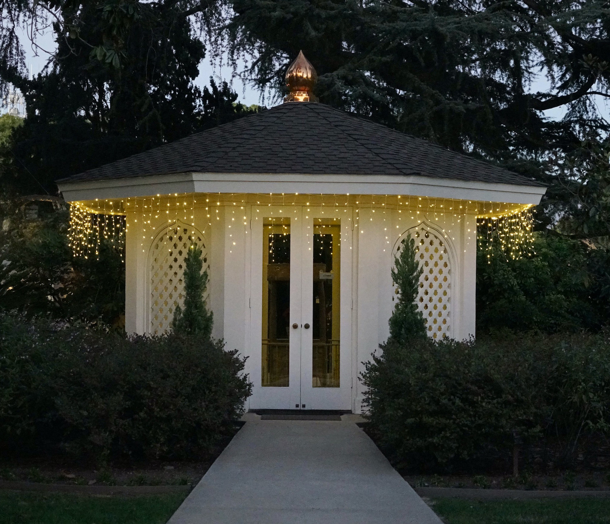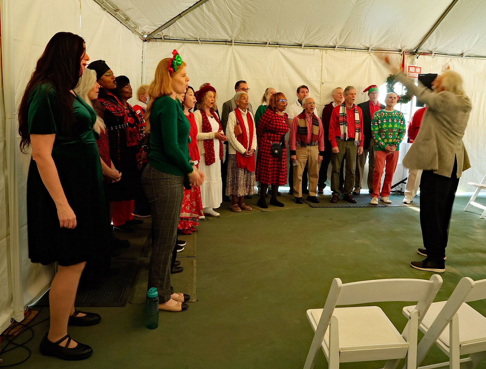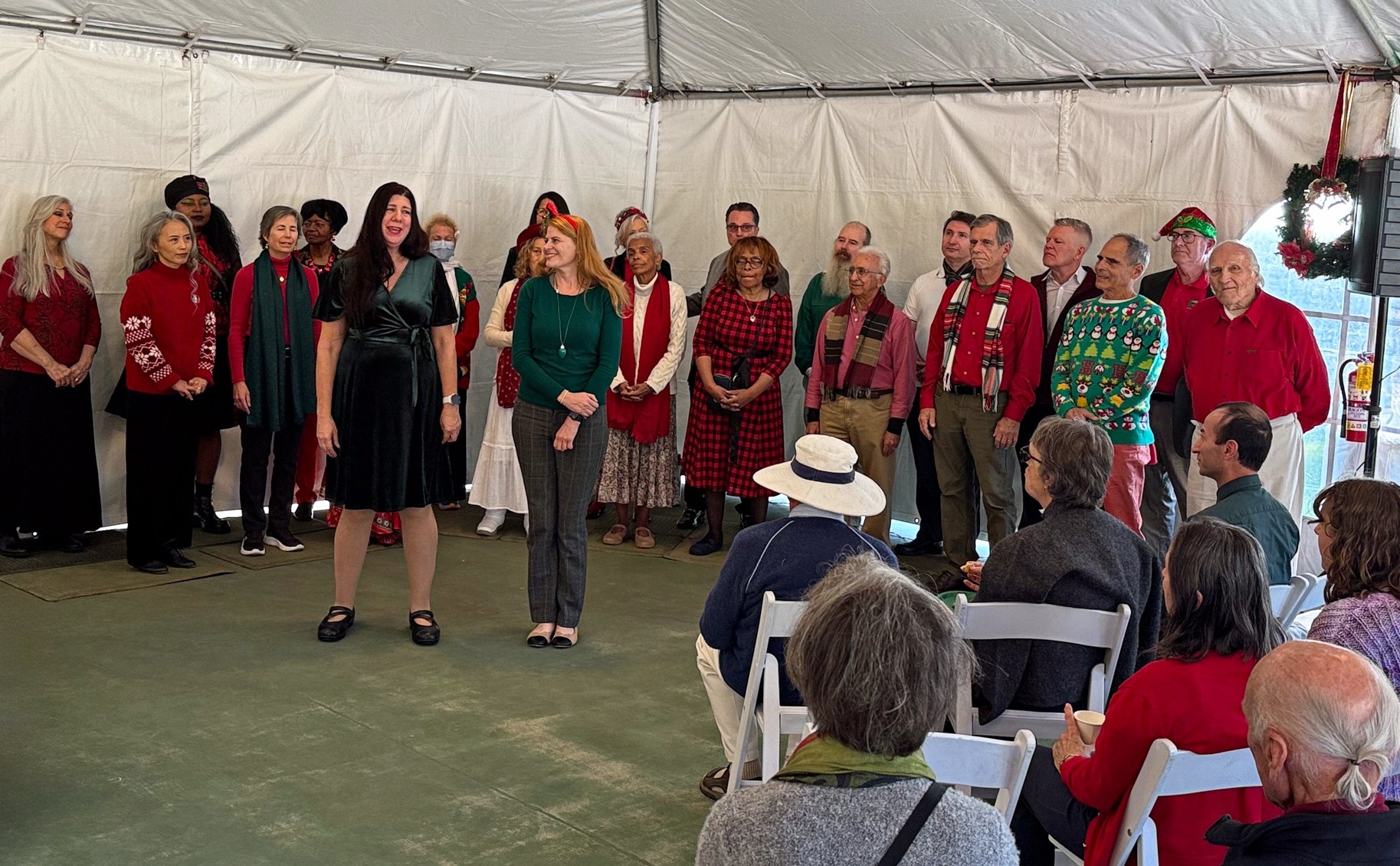 Held on Friday evening, December 5, the festive event drew more than 240 neighbors to the Mother Center, where they were greeted by SRF monks and nuns. Visitors were able to view the many unique decorations in the Reception Hall of the main building and enjoy visits with Santa Claus and his elf under a decorated tent on the tennis court, where refreshments were offered and carolers uplifted the gathering with Christmas cheer. It was a special joy to share the universal spirit of Christmas with our neighbors.