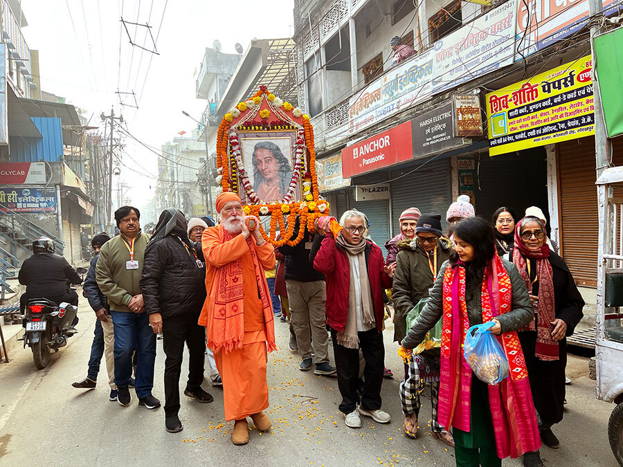 The day’s celebrations began with a Prabhat Feri (procession) along the street approaching Paramahansaji’s birth site. A throng of devotees and friends of YSS, stretching down the length of the street, joined the monastics in continuously and joyously chanting “Jai Guru” — “victory to the Guru” — as they neared the sacred location where the beloved Premavatar, incarnation of divine love, had entered this world.