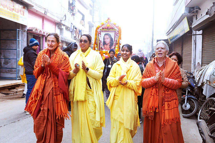 and Sister Yogamayee join in the devotional chanting at the front of the procession.
