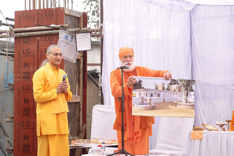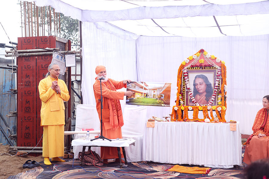 Swami Vishwananda Giri performed aarti to honor the beloved Guru, followed by chanting by the SRF brahmacharinis. Swami Vishwananda, expressing joy at celebrating Paramahansa Yogananda’s birth anniversary at this sacred spot, conveyed gratitude for the Gorakhpur function on behalf of the YSS/SRF President and spiritual head Swami Chidananda Giri, the YSS/SRF monastics, and the worldwide spiritual family of the great Guru. He also thanked the Uttar Pradesh State Government and all involved in the decision to establish a memorial shrine at this site. Swami Vishwananda, accompanied by Brahmachari Saumyananda, then displayed renderings of the original house where Paramahansaji was born and of the now-under-construction shrine (see images below). This was received with appreciation and applause from the audience.